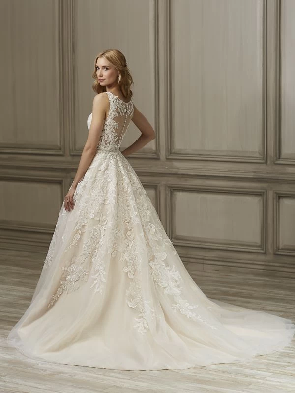 Styled in tulle adorned with beaded lace appliques, this Adrianna Papell Ember sleeveless bridal ball gown has a V-neckline and a delicate beaded belt. Covered buttons accent the illusion back and the full skirt flows into a chapel train.