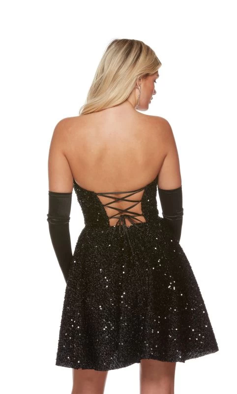 Alyce Paris 3175 A-line homecoming dress is fashioned in novelty sequin net, featuring a corset bodice with a strapless sweetheart neckline and lace-up back. NOTE: Gloves are not included.