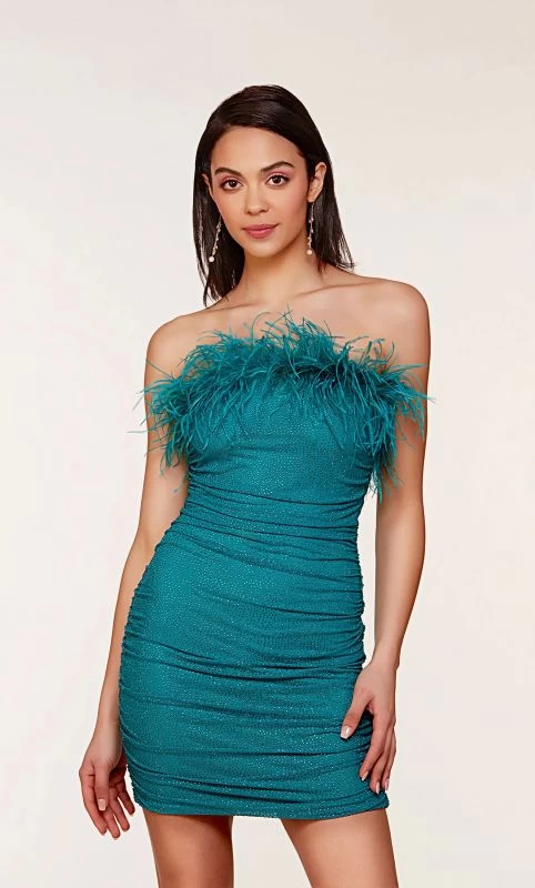 Alyce Paris 4728 fitted short dress is fashioned in stretch mesh with heat-set stones, accented with ostrich feathers around the strapless straight neckline. Allover ruching adds texture to this trendy homecoming dress, finished with a mid-rise back.