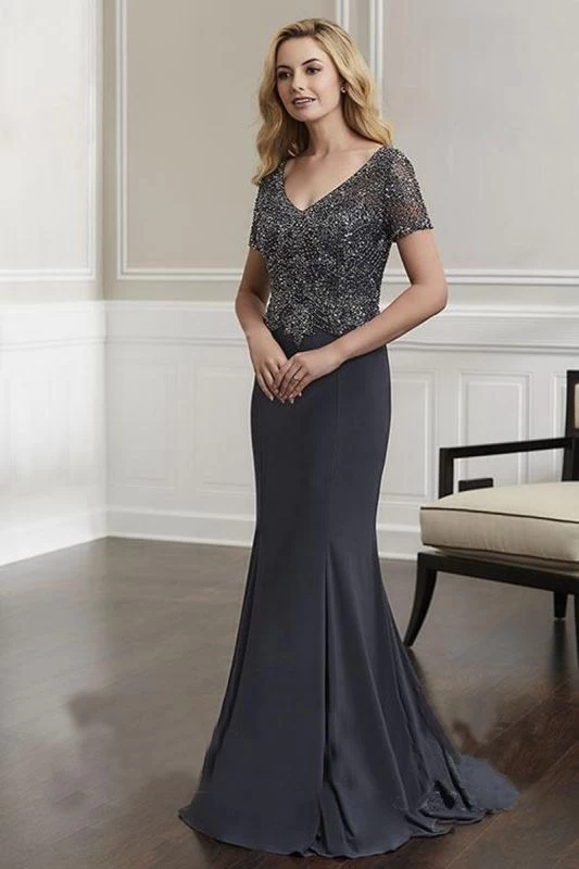 This Christina Wu Elegance 17916 gunmetal formal gown features a fully beaded bodice, with short sleeves to frame the V-neckline and the partial illusion back. The slim-flare jersey skirt is detailed with princess seaming and a sweep train.