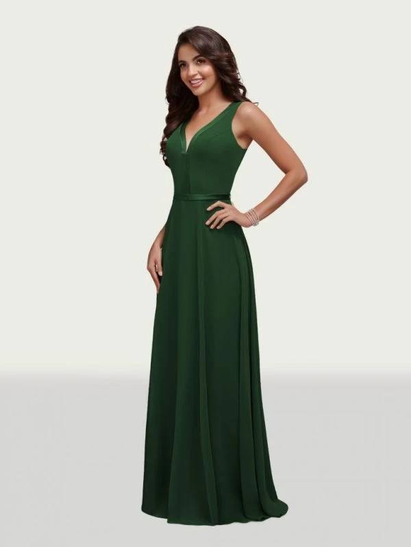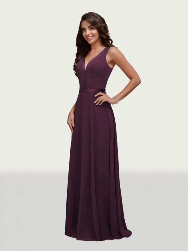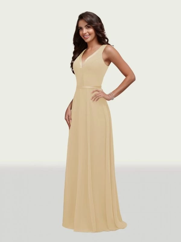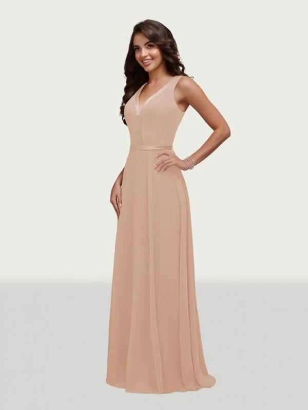 This Christina Wu Celebration 22035 chiffon bridesmaid dress features satin trims around the bodice to accentuate the V-neckline, waist and sheer V-back. This sleeveless gown flatters with a classic A-line silhouette.
