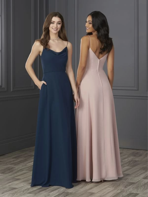 Christina Wu Celebration 22125 chiffon long bridesmaid dress features an A-line silhouette with a cowl neckline, spaghetti straps and a mid-rise V-back. In-seam pockets complete this look.