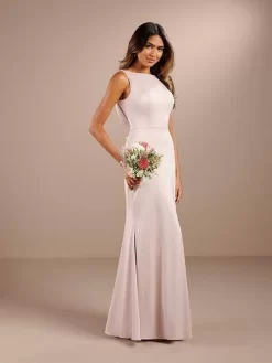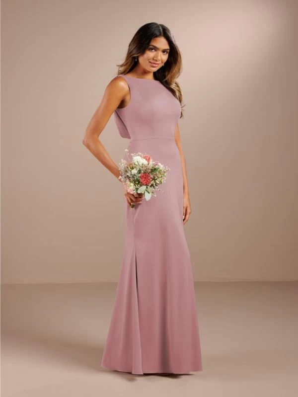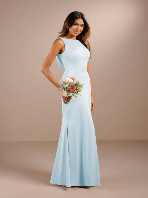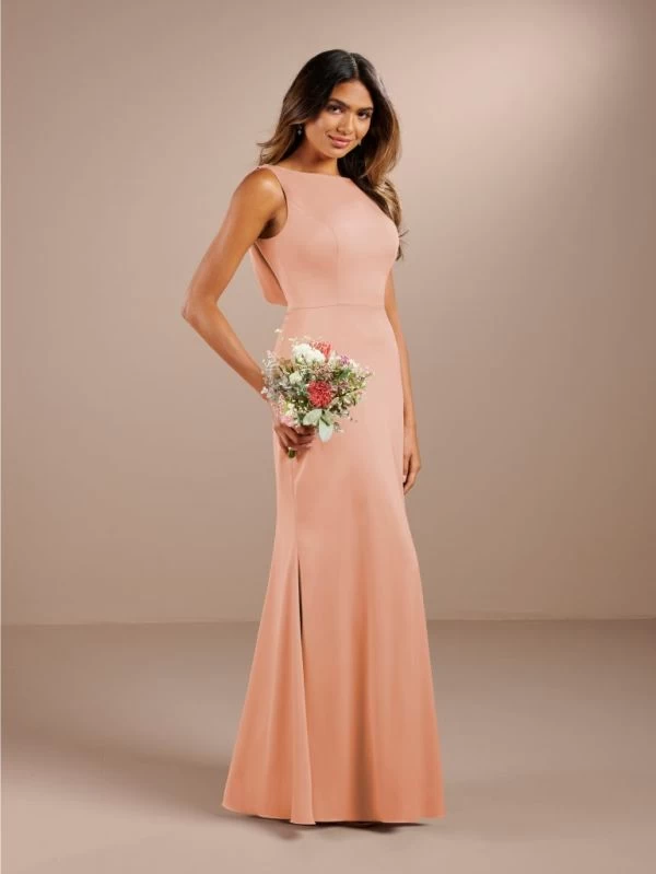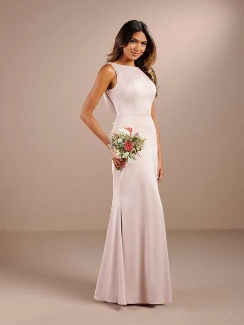 Christina Wu Celebration 22202 matte charmeuse full-length bridesmaid dress features a sleeveless column silhouette with a bateau neckline and an open cowl back.