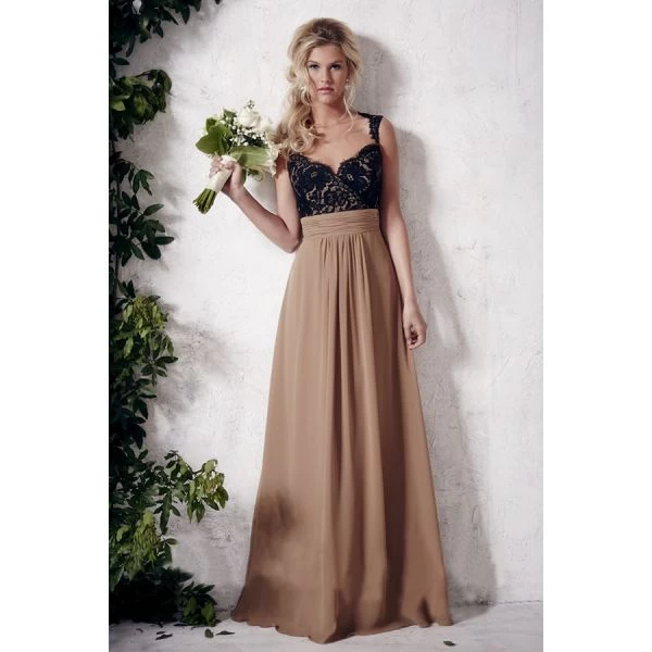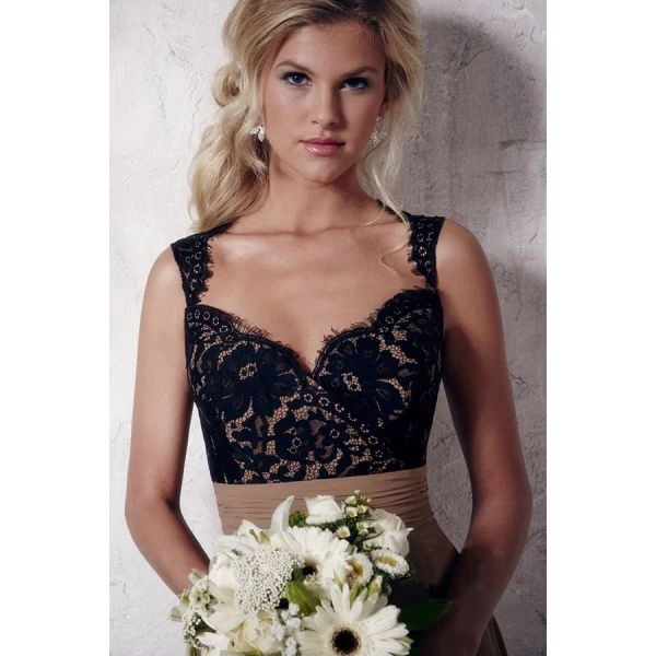 Lace tops the A-line silhouette of Christina Wu Occasions 22649 bridesmaid dress, leaving frilly edges on the modified Queen Anne neckline. A string bow runs atop the semi-open back, which tapers into the ruched band cinching the natural waist. From there, the shirred chiffon springs out and cascades onto the floor with a rich swirl.