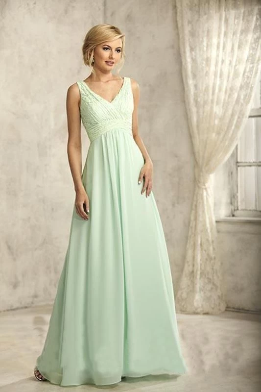This full-length Christina Wu 22734 sleeveless chiffon bridesmaid dress has an asymmetrically pleated surplice lace bodice with V-neckline and V-back. This gown has an inverted empire waistband and the lightly gathered skirt completes the A-line silhouette.
