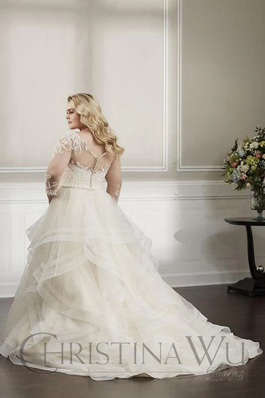 This Christina Wu Love 29329 A-line plus size wedding gown features a lace bodice with a V-neckline, illusion three-quarter sleeves and partial illusion back. A beaded waistband tops the flounce tulle ballgown skirt, finished off with dual horsehair trims and chapel train.