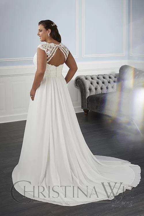 This Christina Wu Love 29338 A-line plus size bridal dress features a lace appliqued bodice, with cap sleeves to frame the notched V-neckline and cutout back. Lace bands accentuate the waist, giving way to the lightly gathered chiffon skirt and semi-chapel train.