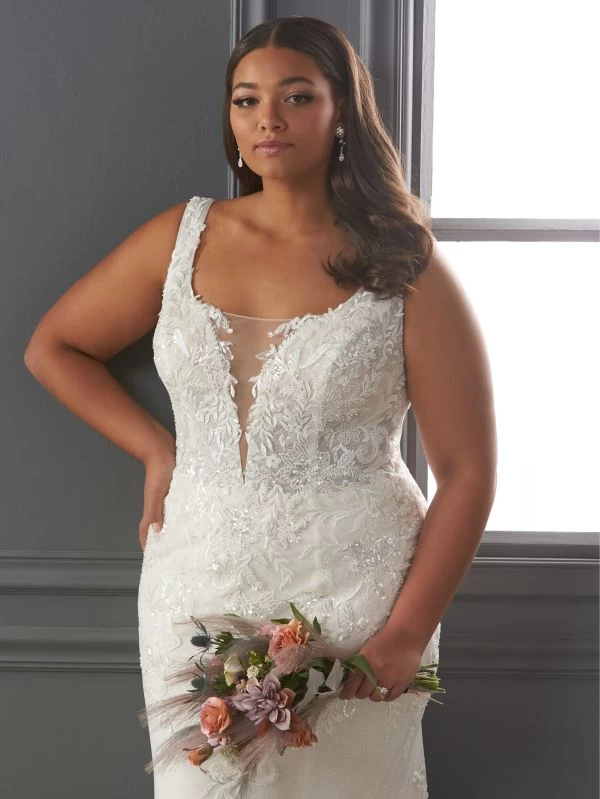Christina Wu Love 29411 fit and flare plus size bridal gown is styled in soft tulle over glitter tulle, finished with a scalloped hem and a chapel train. The semi-sheer bodice features a deep plunging neckline with a mesh insert and a low square back with covered buttons. Beaded lace appliques richly embellish this sleeveless wedding dress.