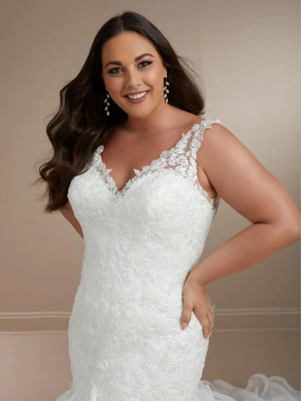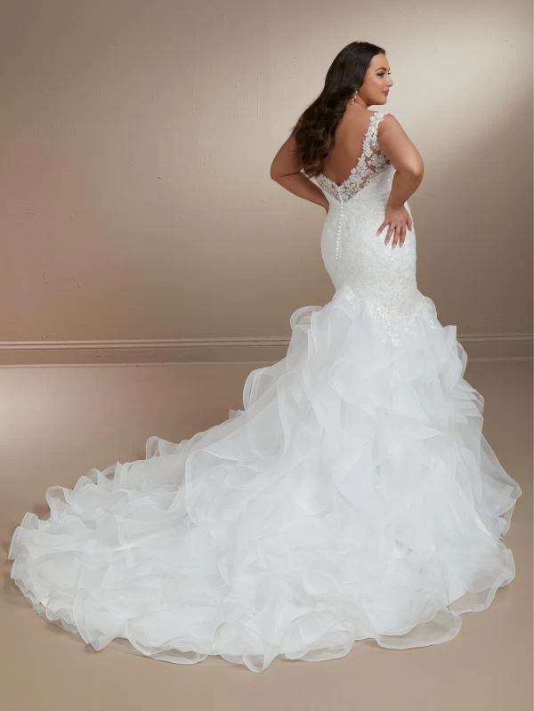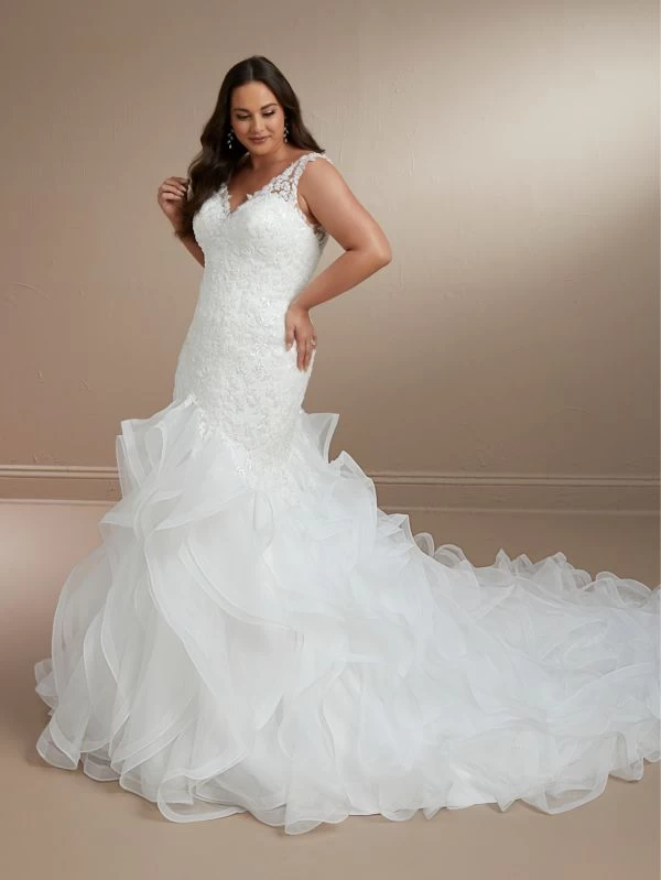Christina Wu Love 29444 trumpet silhouette plus size bridal gown features a beaded lace bodice with a V-neckline, lacy straps and a low illusion V-back. Covered back buttons point to the ruffled organza skirt, jazzed up with horsehair edging and finished with a chapel train.