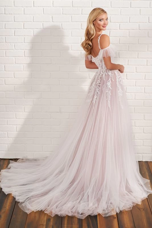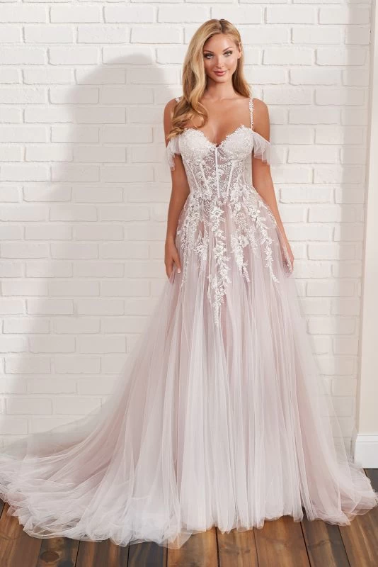 Enchanting by Mon Cheri 122181 A-line bridal dress features a corseted sheer bodice with a sweetheart neckline, edged with lace and ruffle straps. Floral lace appliques richly embellish this soft tulle wedding gown, finished with a fully gathered skirt and a chapel train. Set includes a separate skirt lining.