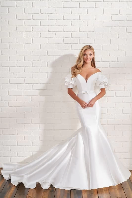 Enchanting by Mon Cheri 122185 fit and flare wedding gown is styled in luxe mikado, with an off-the-shoulder sweetheart neckline and cuffed puff sleeves. Multiple seaming contours this elegant bridal dress, finished with a detachable bow belt and covered back buttons that extend to the semi-cathedral train.