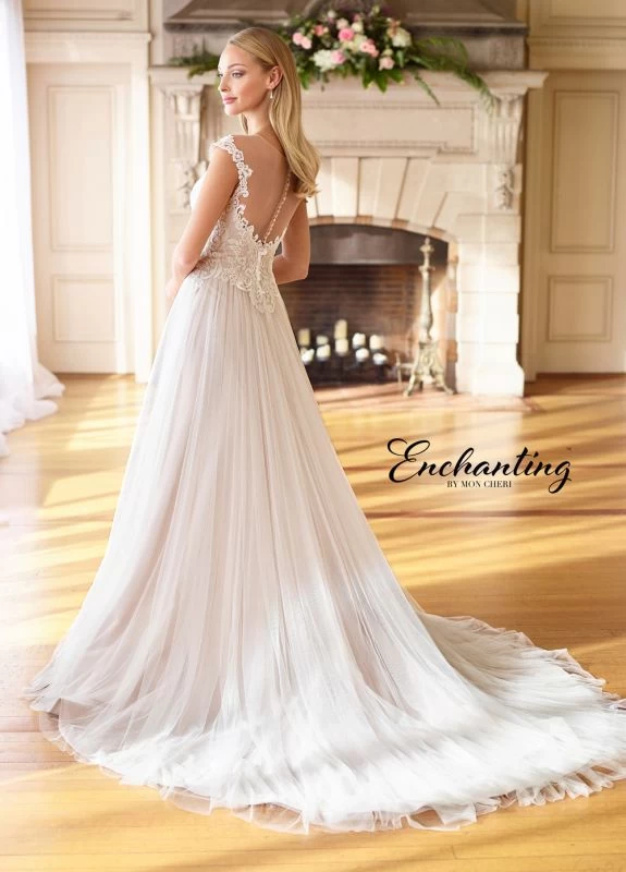 This Enchanting by Mon Cheri 218184 A-line bridal dress has a lace bodice with a sheer neckline and illusion cap sleeves, projecting an off-the-shoulder look. The finely gathered tulle skirt cascades to a chapel train, offsetting the crystal-buttoned sheer back.