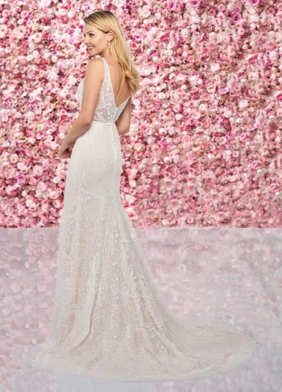 A sheer inset accents the illusion V-neckline atop the sweetheart bodice of this Enchanting by Mon Cheri 219142 sleeveless fitted bridal dress. This gown is styled in beaded Schiffli lace and Chantilly lace, over a stretch lining. Covered buttons adorn the illusion V-back and a slim band accentuates the waistline. A court train completes this gown. Available in sizes 0-20 and 18W-26W