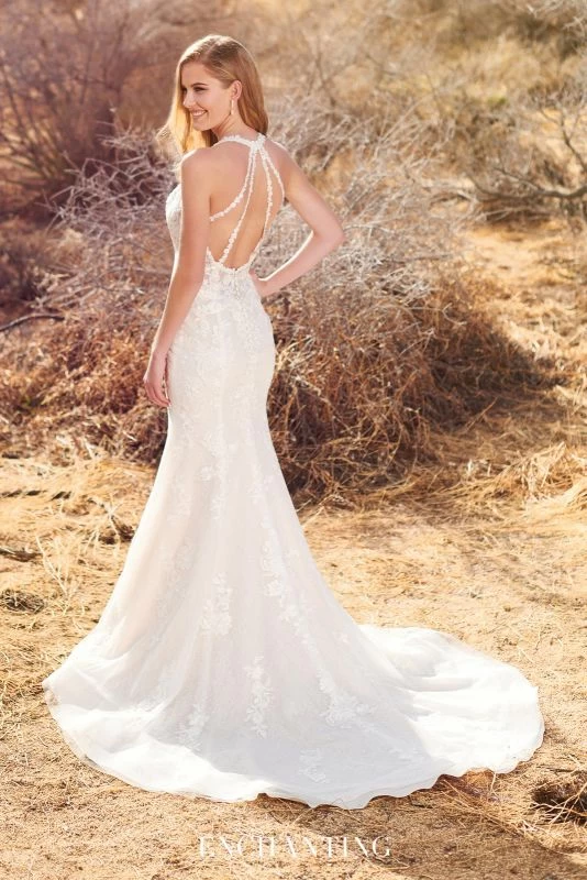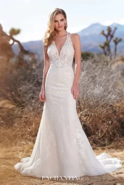 Enchanting by Mon Cheri 220117 fit and flare bridal gown features a semi-sheer bodice with floral trims on the plunging halter neckline and strappy back. This form-fitting wedding dress is crafted in tulle over lace, jazzed up with sequined appliques, and finished with back buttons and a semi-chapel train.