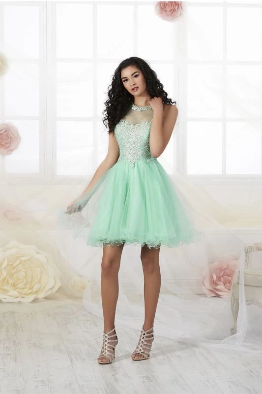 Metallic lace adorns the sweetheart bodice and the illusion jewel neckline of this House of Wu Damas 52428 sleeveless tulle cocktail dress. Illusion panels frame the cutout back atop the lace-up closure. The A-line skirt with an above the knee lettuce hemline falls in layers of gathered tulle.