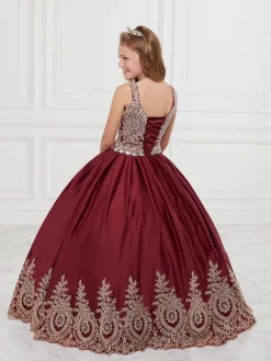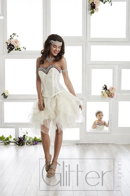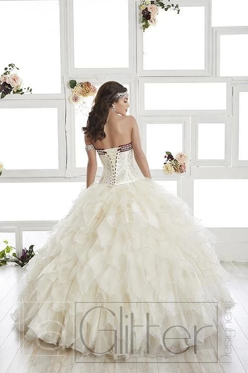 House of Wu La Glitter 24010 is a three-piece quince dress, featuring a short and full ballgown skirts made from tiers of glitter tulle and iridescent organza. The corseted top is embellished with columns of rhinestones, bordered with a basque waist and a contrasting beaded band on the strapless sweetheart neckline. The laced-up back completes the look.