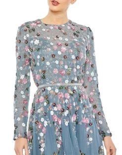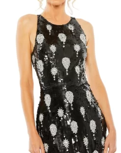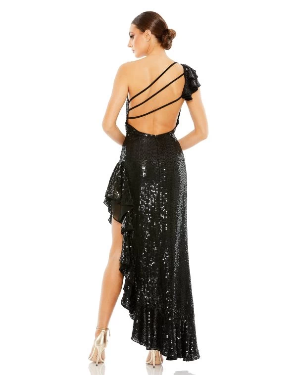 Mac Duggal 10900 black prom gown is fashioned in allover sequins, with a ruffle sleeve edging the one-shoulder neckline and the strappy open back. This fitted formal dress finishes in a side high-low skirt with ruffle trims.