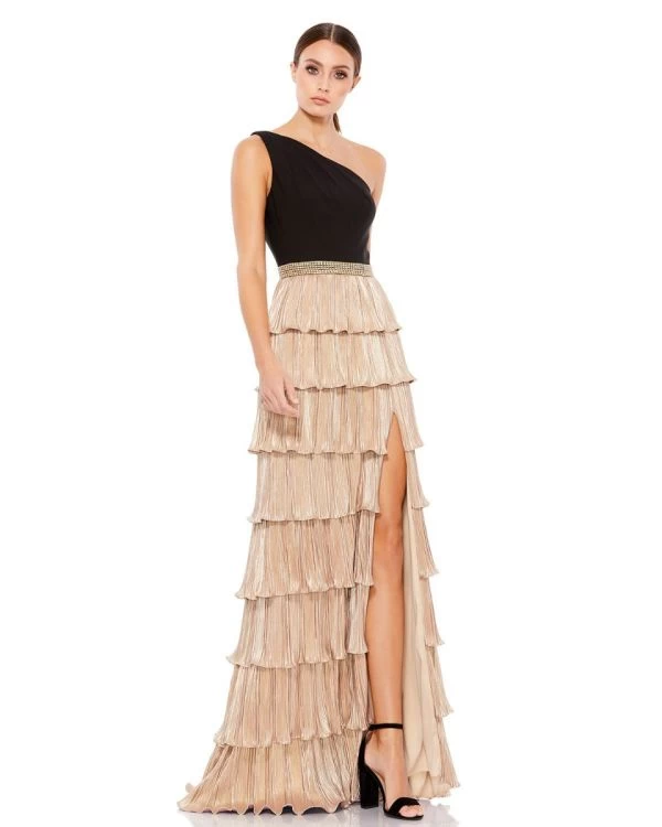 Ieena for Mac Duggal 26541i black gold prom gown features a solid bodice over a multi-tiered metallic skirt, crowned with a pleated one-shoulder neckline. A beaded waistband tops the high slit skirt, crafted in novelty ribbed fabric and finished off with a slight brush train.