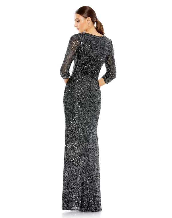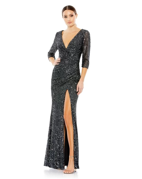Ieena for Mac Duggal 42015 light gold formal dress features a fit and flare silhouette in allover sequins, with a V-neckline and three-quarter sleeves. Directional ruching stretches over the surplice bodice and skirt, finished off with a thigh-high slit.