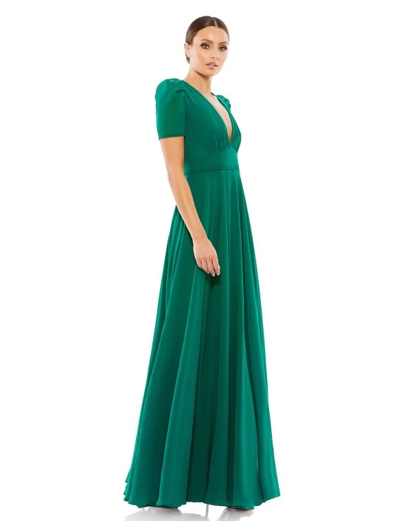 Ieena for Mac Duggal 55681 empress green formal gown is crafted in luxe chiffon, featuring a ruched bodice with a plunging neckline and butterfly sleeves. A contour waistband accents this A-line prom dress, finished with a full skirt.