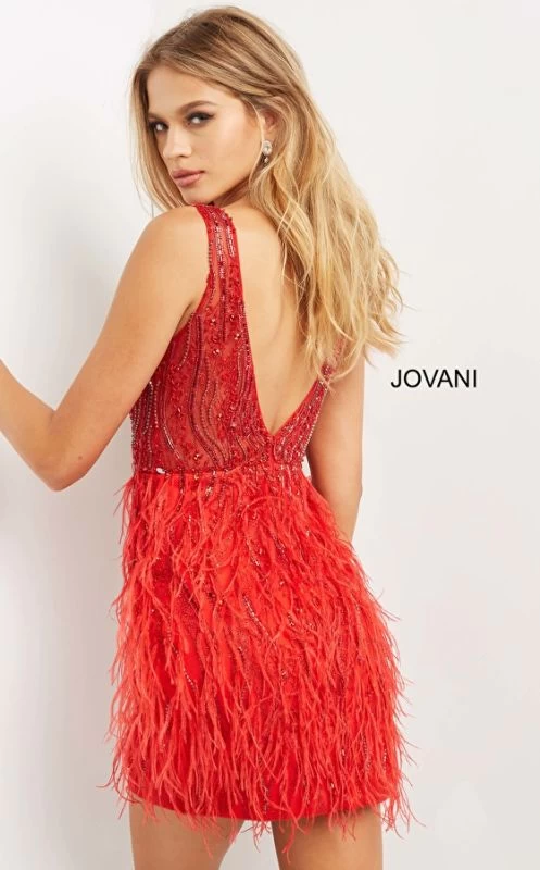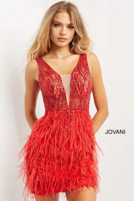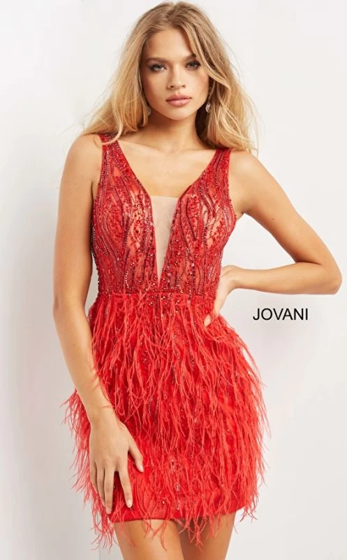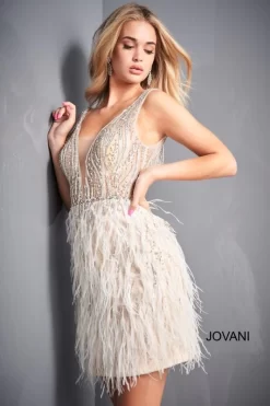 Jovani 04619 beige short dress showcases a fitted silhouette in twine beaded mesh, featuring a sheer illusion bodice over a fully lined feather skirt. A sheer inset supports the plunging neckline.