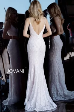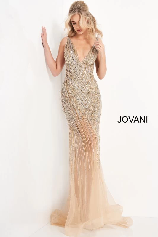 Jovani 1162 nude formal gown features a fitted silhouette in embellished mesh, with a low V-neckline, sheer side insets, and an open V-back. Flattering linear beadwork coats the bodice and fades gradually into the skirt, creating a sheer lower skirt that flares to a horsehair hem and sweep train.