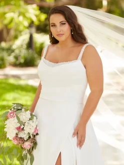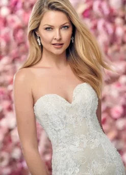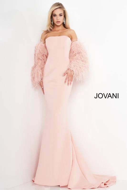 Jovani 1226 white formal gown features a fitted silhouette in stretch scuba, with a strapless straight neckline, court train, and detached feather sleeves.