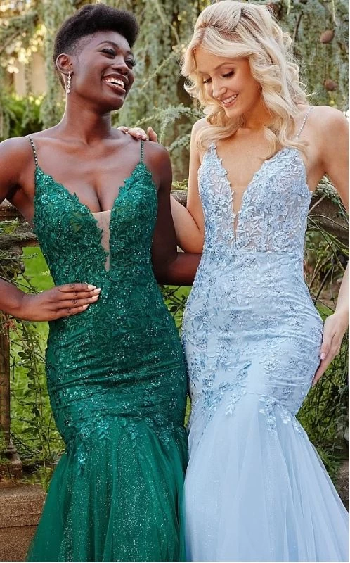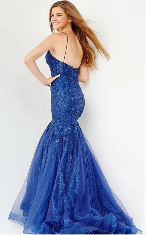 JVN by Jovani JVN07398 navy prom gown is fashioned in tulle over glitter tulle, with a deep plunging neckline, beaded spaghetti straps, and an open back. Beaded floral embroidery stretches over the bodice to mid-thigh of this trumpet silhouette formal dress, finished with a horsehair hem and a semi-chapel train.