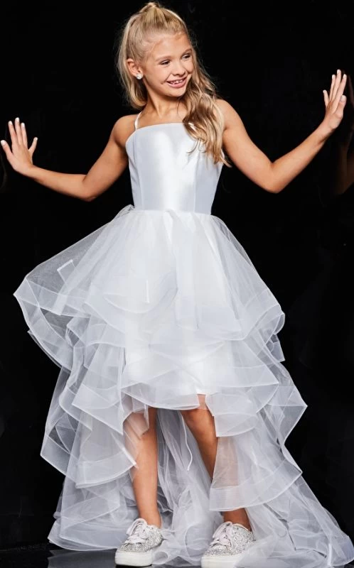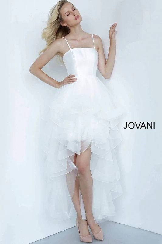 Jovani K66708 off white prom gown features a fitted satin bodice over a tiered high-low skirt, with a straight neckline and spaghetti straps. Horsehair edging lends volume and definition to the tulle skirt.