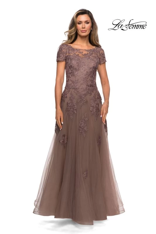 La Femme 27958 mother of the bride gown features a lace bodice over a tulle skirt, with a sheer scoop neckline, short sleeves, and a partial illusion back. Beaded floral embroidery appliques luxuriously embellish this A-line evening dress.