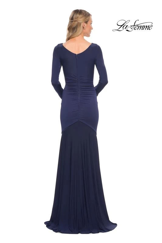 La Femme 30010 evening dress features a column silhouette in premium jersey, with gorgeous ruching from the surplice bodice to the asymmetrical drop waist. A V-neckline and long sleeves top this flattering formal gown, finished with a zipped-up back and brush train.
