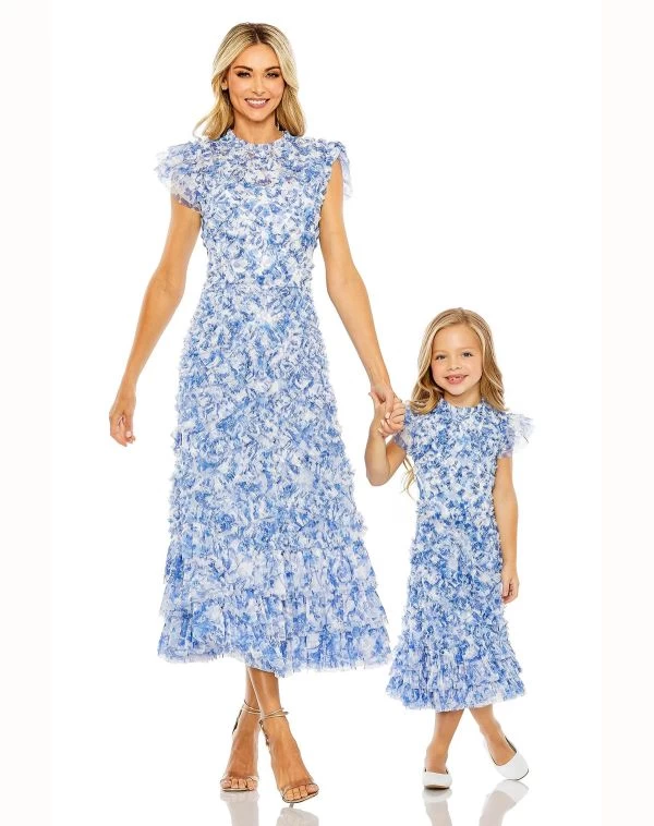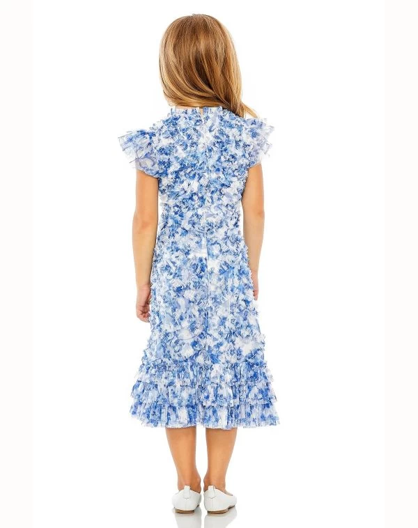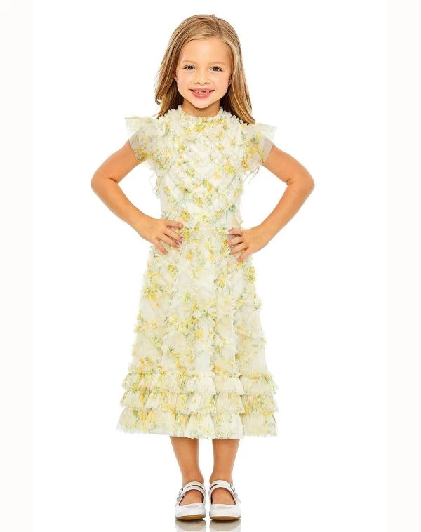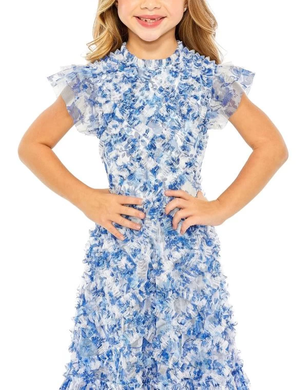 Mac Duggal 8215 tea-length little girl pageant dress features an A-line silhouette with cute short flutter sleeves and a ruffled high neckline. This short pageant dress is crafted in floral printed fabric, embraced with a lattice-patterned ruffles all over, and finished with multi-tiered hem ruffles.