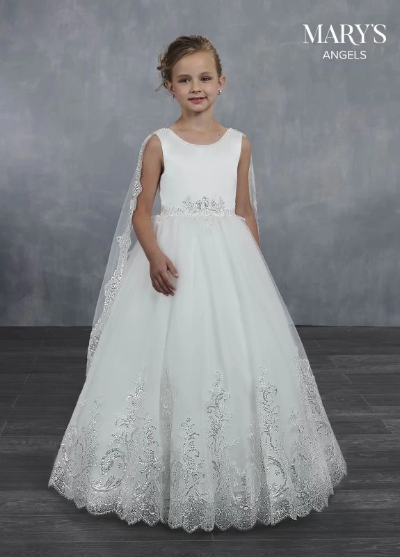 Marys Angel MB9046 sleeveless flower girl ballgown is a combination of satin and tulle with sequin lace appliques, finished with a detachable watteau train. A beaded scoop neckline and a laced-up back top this little girl dress, jazzed up with sparkly accents around the waist and the scalloped hem.