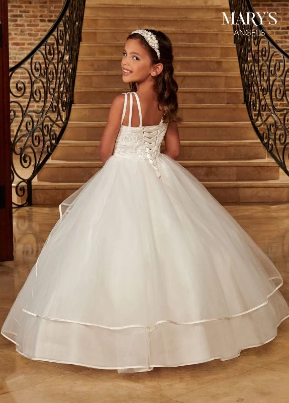 Marys Angel MB9091 sleeveless flower girl ballgown features a beaded embroidered satin bodice with a scoop neckline and a strappy lace-up back. Layers of tulle comprise the tiered skirt, jazzed up with satin edging.