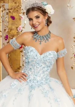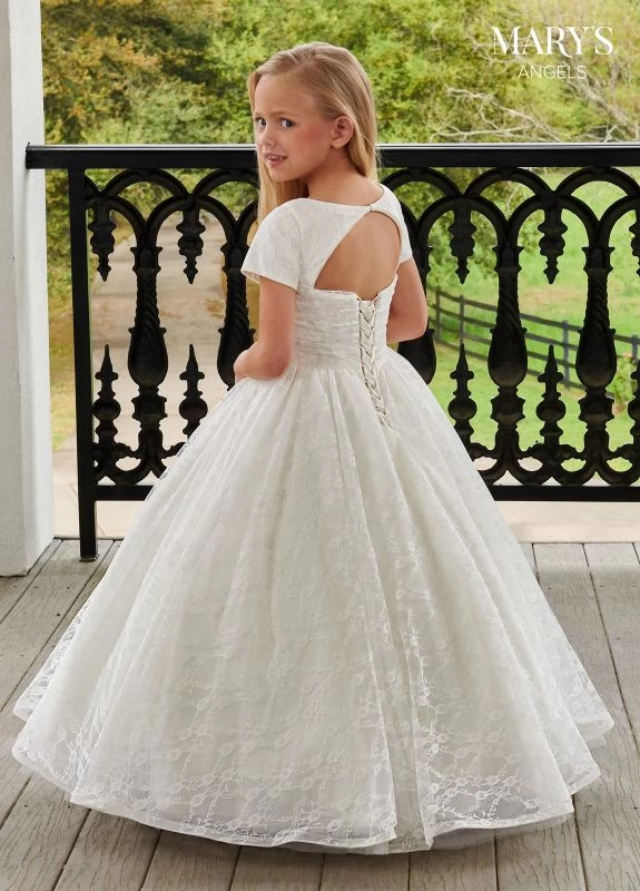 Marys Angel MB9102 flower girl ballgown is styled in allover lace, detailed with a scoop neckline, short sleeves, and a laced-up cutout back. Dainty embroidery and a 3D flower accent the pleated crossover waist, giving way to the fully gathered skirt and horsehair hem.