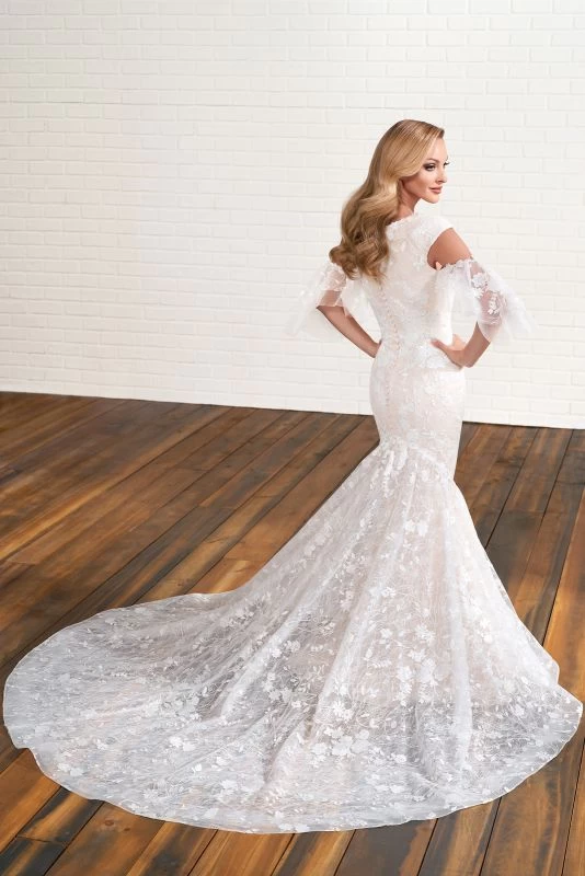Modest Bridal by Mon Cheri MOD203 fit and flare bridal gown is styled in allover lace, with an embellished scoop neckline and cold-shoulder flutter sleeves. Sequin floral embroidery adds dimension to this conservative wedding dress, finished with covered back buttons and a cathedral train.