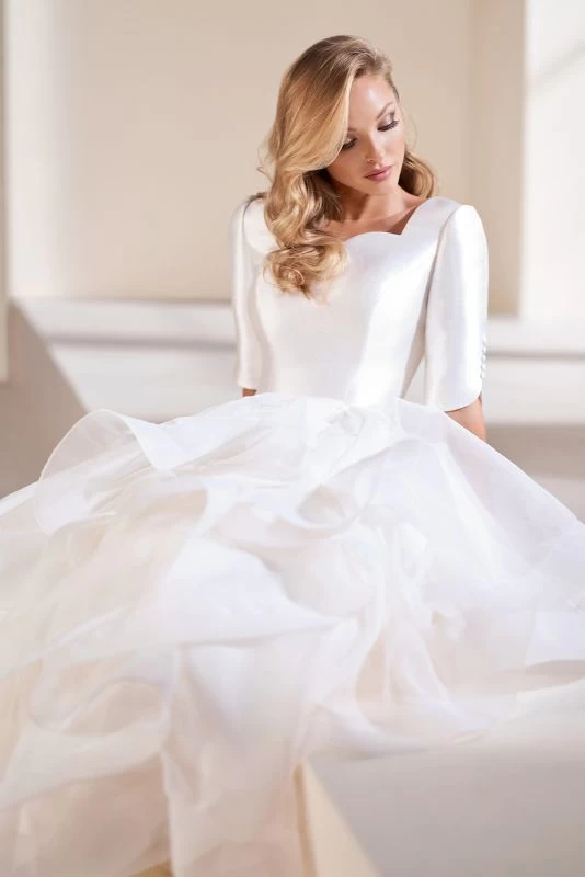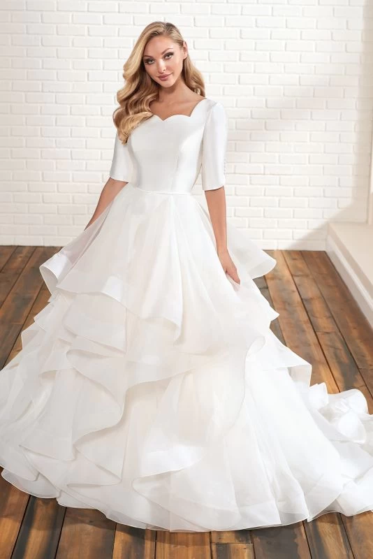 Modest Bridal by Mon Cheri MOD204 bridal ballgown features a fitted mikado bodice with a sweetheart neckline and elbow-length sleeves with buttons. A thin waistband tops the flounce organza skirt, finished with covered back buttons and a cathedral train.