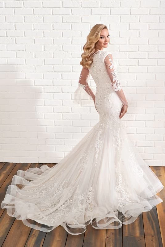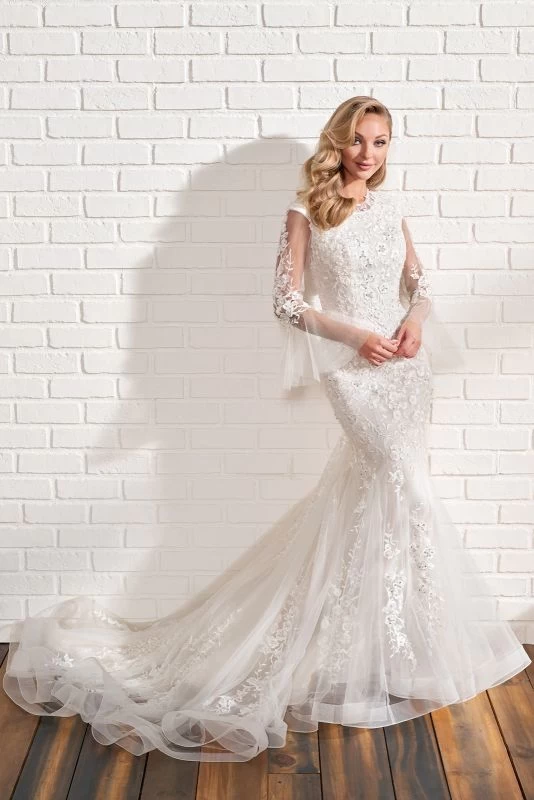 Modest Bridal by Mon Cheri MOD205 trumpet silhouette wedding dress is fashioned in soft tulle, with an illusion jewel neckline and illusion bell sleeves. Beaded floral appliques richly embellish this conservative bridal gown, finished with a godet skirt that flares to a horsehair hem and chapel train. Covered back buttons complete this look.
