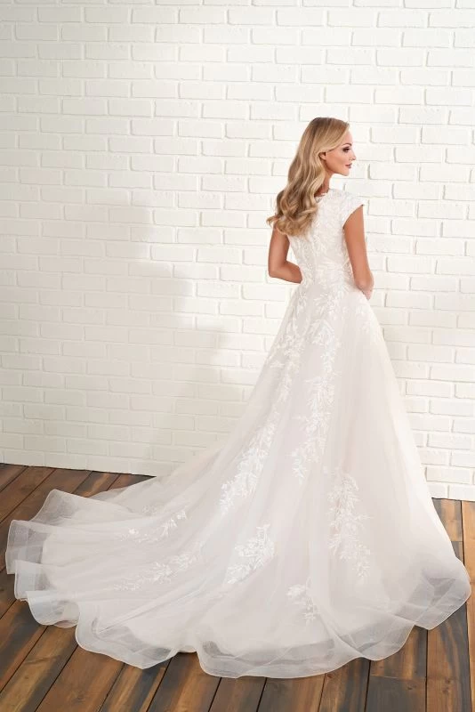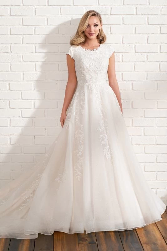 Modest Bridal by Mon Cheri MOD206 A-line wedding gown is styled in glitter tulle, with an illusion scoop neckline, cap sleeves, and covered back buttons. Beaded embroidery and 3D flowers embellish this conservative bridal dress, finished with a horsehair hem and a cathedral train.