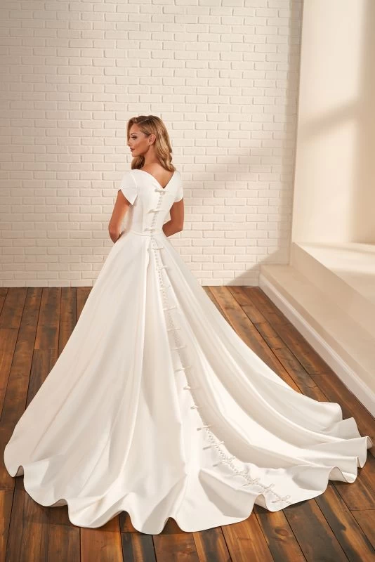 Modest Bridal by Mon Cheri MOD221 A-line wedding gown is fashioned in luxe mikado, with dainty bows and covered buttons down the back to the cathedral train. This conservative bridal dress is completed with a sweetheart neckline and tulip sleeves.