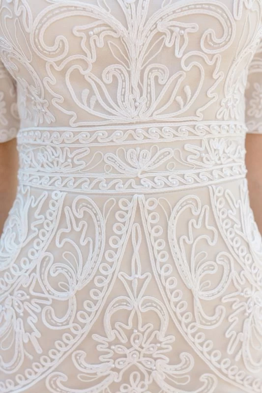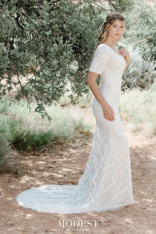 Modest Bridal by Mon Cheri TR12022 column-style bridal gown is crafted in soutache ribbonwork on tulle, with a scoop neckline and short sleeves. Faux pearls embellish this slim wedding dress, finished with a set-on waistband and semi-chapel train. Available in plus size.