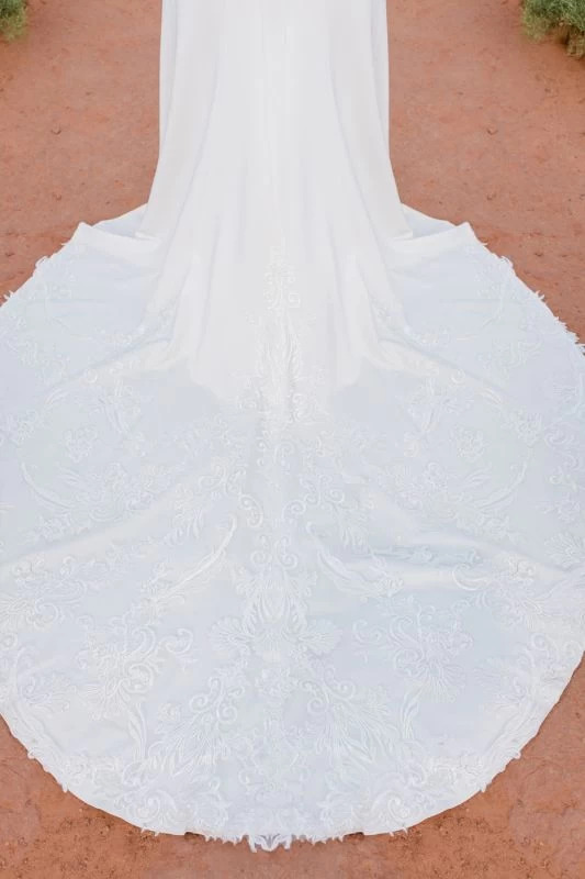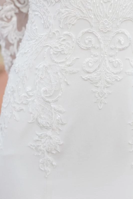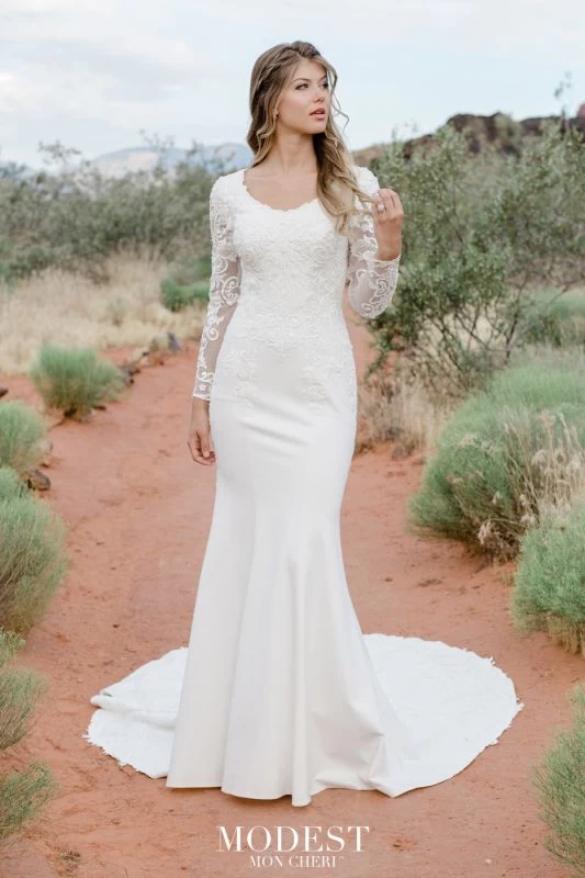 Modest Bridal by Mon Cheri TR12023 form-fitting wedding gown is crafted in stretch heavy jersey, with a scoop neckline and illusion long sleeves. Beaded lace appliques embellish the fitted bodice and chapel train. Available in plus size.