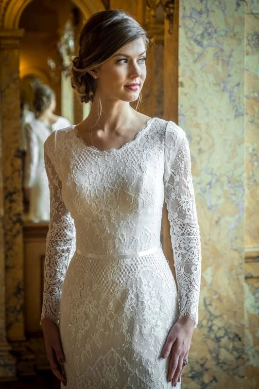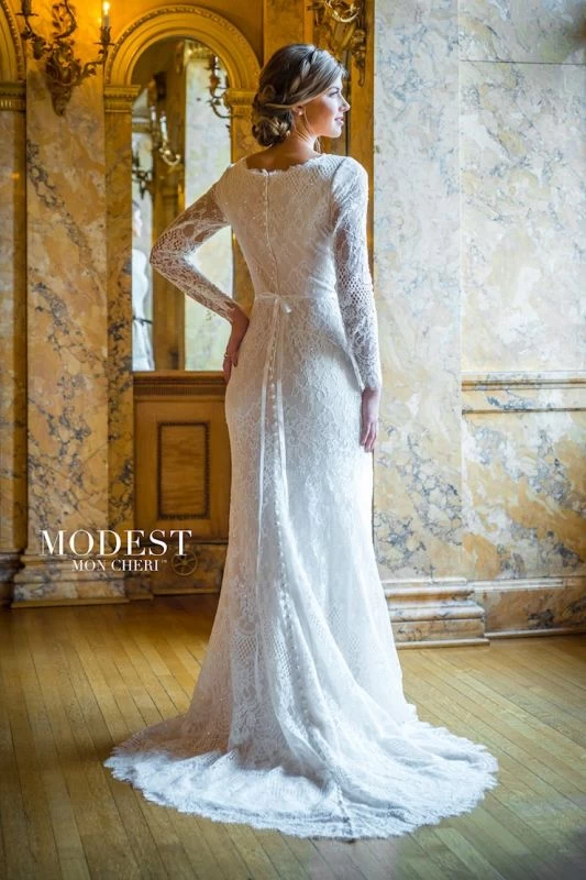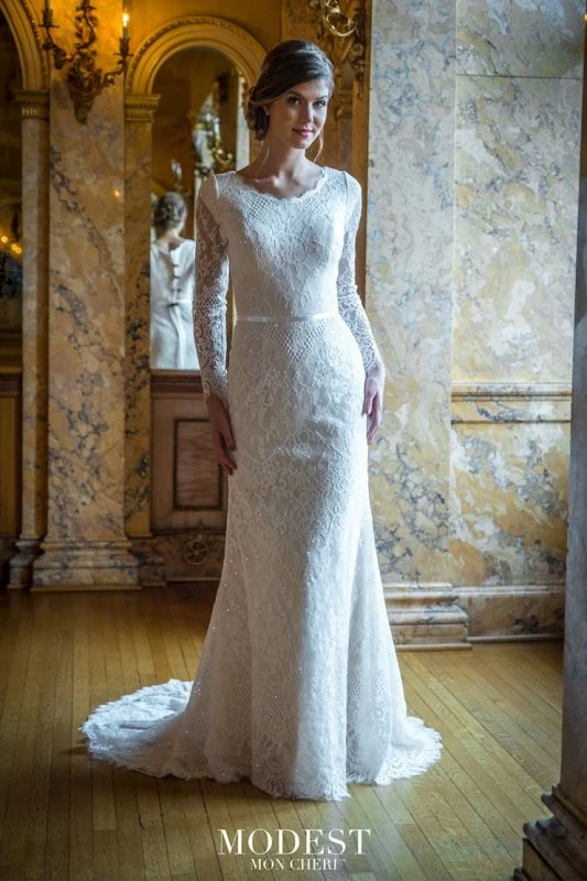 Modest Bridal by Mon Cheri TR22063 fit and flare bridal dress is crafted in sequined lace, with a scalloped scoop neckline and illusion long sleeves. A tie-back satin ribbon belt accents this allover lace wedding gown, finished with covered buttons from the back zipper to the court train. Eyelash scallops trim all edges.