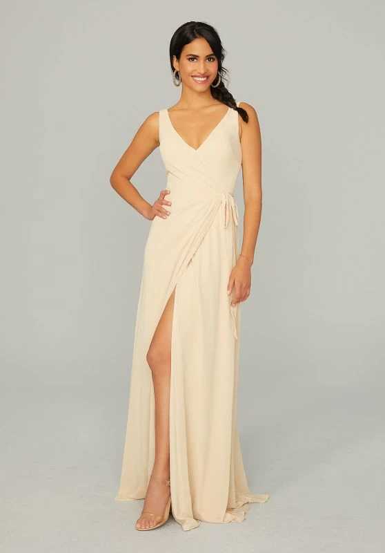 Mori Lee 21771 full-length chiffon bridesmaid dress features a faux wrap silhouette with a V-neckline and V-back, jazzed up with a tie-waist detail. Soft ruching adds texture to this sleeveless formal gown, finished with a thigh-high slit on the crossover skirt.