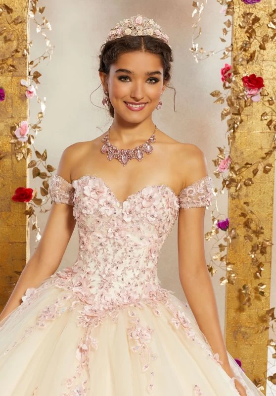 This Mori Lee Valencia 60071 tulle quince gown showcases a strapless bodice with a sweetheart neckline, lace-up back and detachable off-the-shoulder sleeves. This beautiful ball gown is adorned with three-dimensional floral appliques and embroidery. The full skirt cascades from the basque waistline and a matching stole complements this dress.