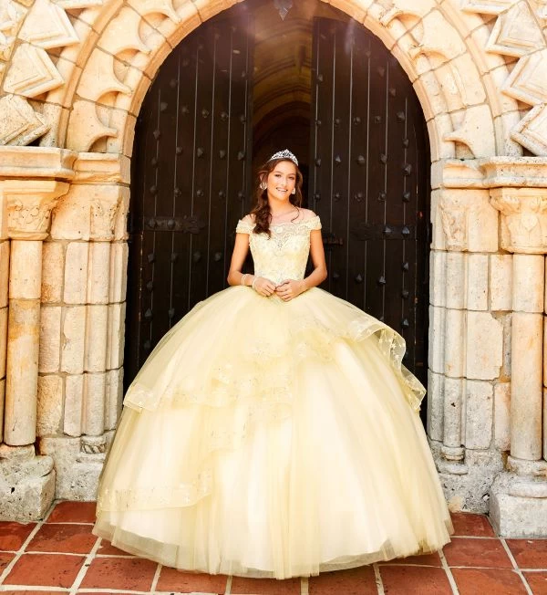 Princesa by Ariana Vara PR11926 light yellow quinceanera gown is styled in soft tulle, with a scalloped off-the-shoulder neckline and cold-shoulder sleeves. Beaded embroidery richly embellished this basque waist ballgown, finished with two-tiered high-low overskirts, horsehair edging, and chapel train. This pretty sweet 16 dress is completed with a partial illusion keyhole back and a matching shawl.