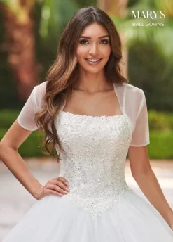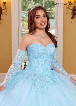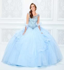 Princesa by Ariana Vara PR11938 light blue sweet 16 dress features a crystal beaded bodice with an illusion scoop neckline and a laced-up keyhole back. The beaded basque waist gives way to the sparkle tulle ball skirt, with double horsehair edging on the high-low peplum, scattered stones, and a chapel train. Set includes a matching shawl.