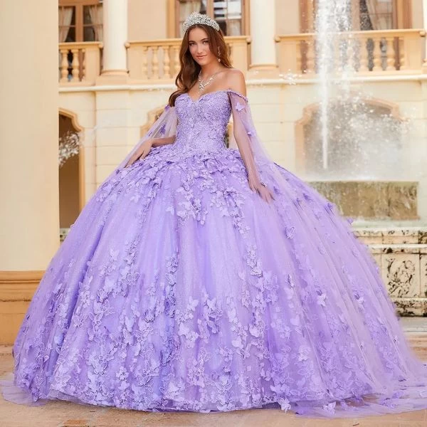 Princesa by Ariana Vara PR12261 hot pink quince dress is fashioned in glitter tulle with beaded floral embroidery, 3D butterfly appliques and LED lights. The embellished sweetheart bodice is detailed with spaghetti straps, lace-up back and detachable hanging sleeves that segue to a cathedral train. This basque waist ballgown comes with a matching capelet.