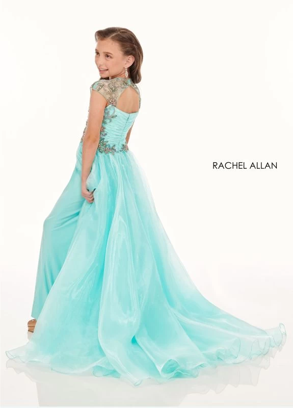 Rachel Allan 10019 fitted little girl pageant jumpsuit in organza crafted with floral-patterned beads framing the square neckline and ruched bodice. This mini pageant jumpsuit features beaded cap sleeves, a cut-out back, and wide-leg pants, finished with an overskirt and a zipper closure.