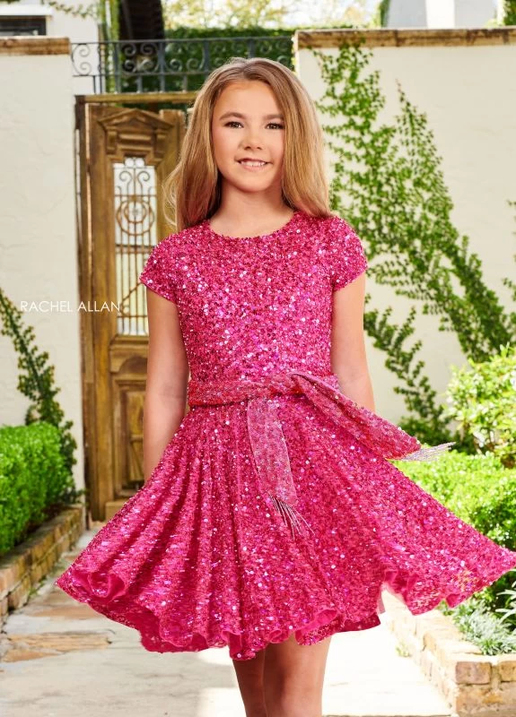 Rachel Allan 10117 fully sequined little girl pageant dress in stretch tulle features a round neckline, cap sleeves, and a matching tie-belt with beaded fringe. The gathered skirt adds flare to this fit-and-flare short mini pageant dress.